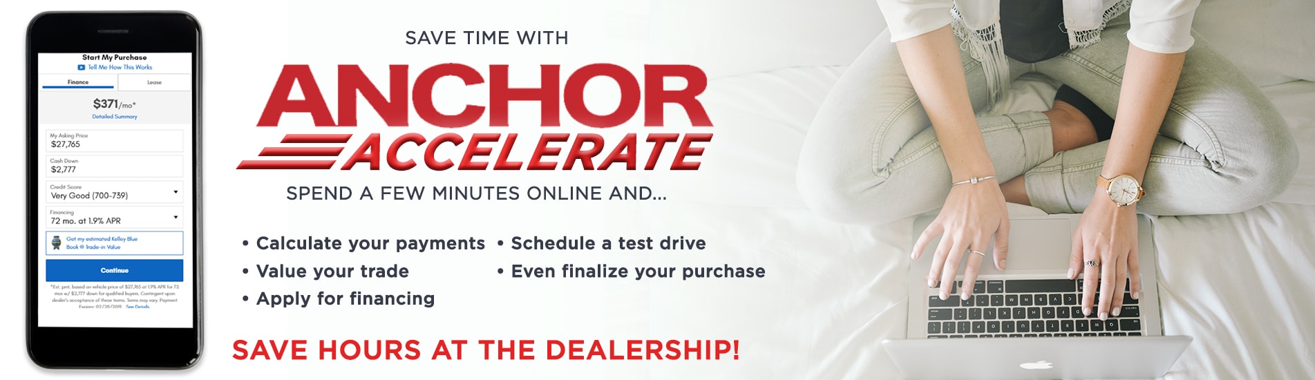 At Anchor Nissan, You are our top priority, which is why we now offer Anchor Accelerate, The 24/7. Quick. Convenient and simple way to shop for your next vehicle. Browse our new or used inventory until you find the right vehicle. Then, right from your couch, you can calculate the right payment for you, get the value of your trade, apply for financing, schedule a test drive and Even finalize your purchase.This process saves you hours at the dealership. It eliminates the unnecessary haggling at the dealership. You get to build out every step of your car purchase right from the comfort of your home. What could be easier!